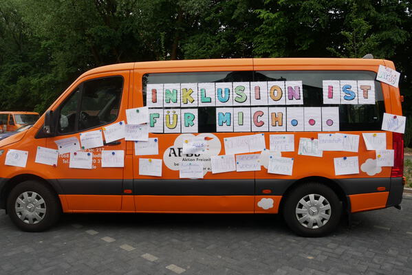 Ein zentrales Element des Tages war die Fotoaktion „Inklusion ist für mich …“. Die Besucher wurden eingeladen, ihre Gedanken auf Kärtchen zu notieren und auf einem der bekannten orangefarbenen Jugendheimbusse zu befestigen. Daraus entstand ein starkes gemeinschaftliches Bild voller individueller Botschaften zum Thema Inklusion.