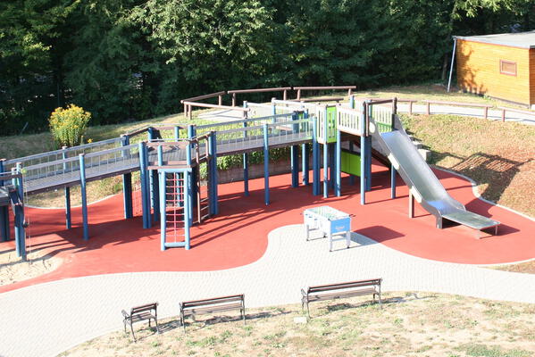 Der barrierefreie, umzäunte Spielplatz verfügt über rollstuhlgerechte Spielgeräte wie Schaukel oder Rutsche. Zudem gibt es eine große Fußballfläche, zahlreiche Sitzmöglichkeiten sowie eine Grillecke mit Gasgrill und Pizzaofen.